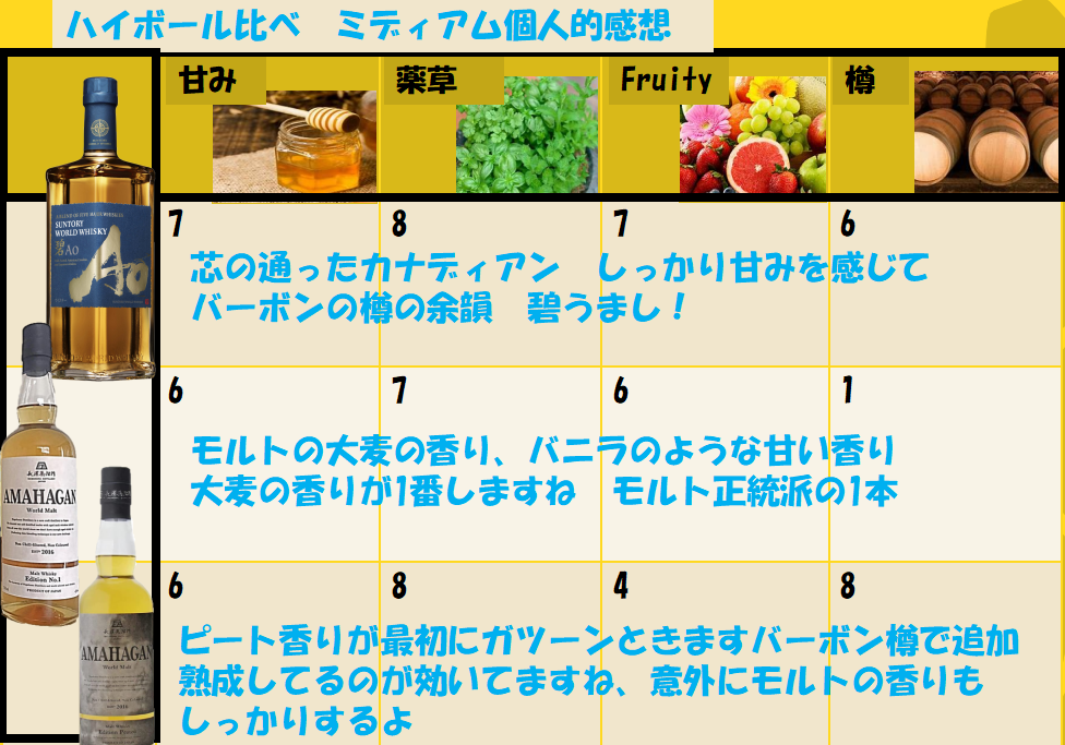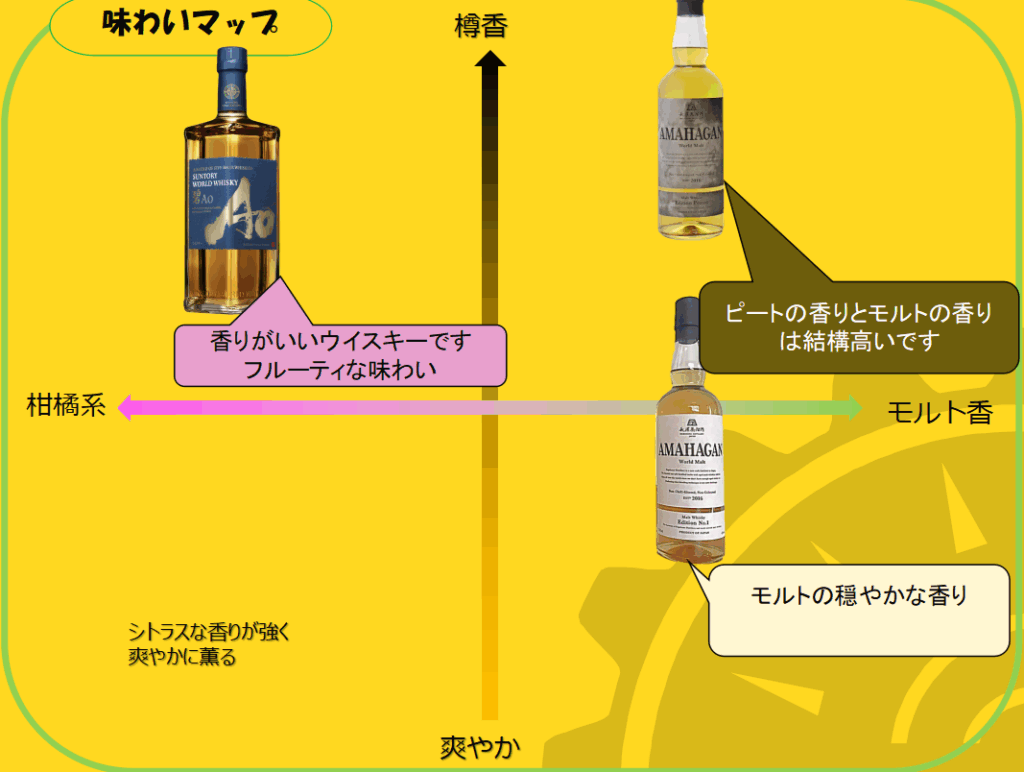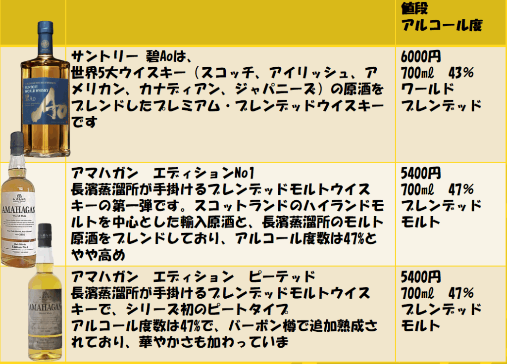 アマハガン World Malt Edition No.1 とエディション ピーテッドは、希望小売価格と同じぐらいの値段で売られていますが、サントリー碧Aoは1割程度安くなって売られていることが多く見受けられます、なので酒屋さんでは、同程度の価格帯で売られていますね。(私の感覚ですが)