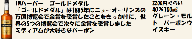 IWハーパー ゴールドメダル2200円ぐらい 40% 700㎖ グレーン・モルト バーボンウイスキー