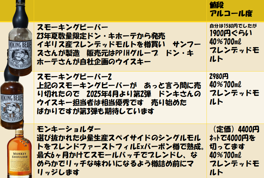 スモーキングビーバー2は、スコットランドから モルトウイスキーを樽買いしてブレンドですね 今は原酒不足となっていますので ドン・キホーテさんのバイヤーも大変でしょう ブレンデッドモルトのブレンダーはサンフーズの方?ドン・キホーテの方?どなたがブレンドしているのでしょうか?