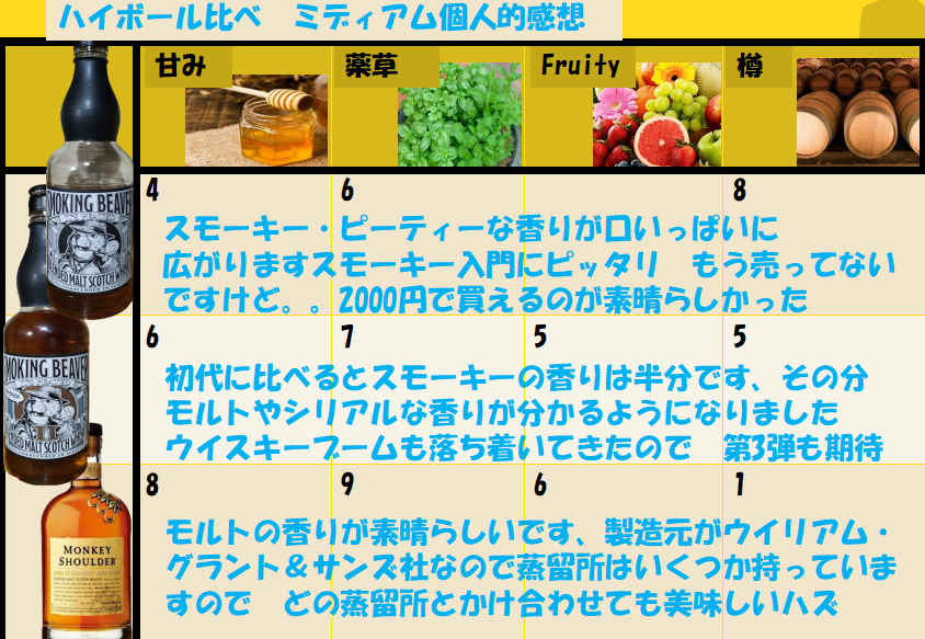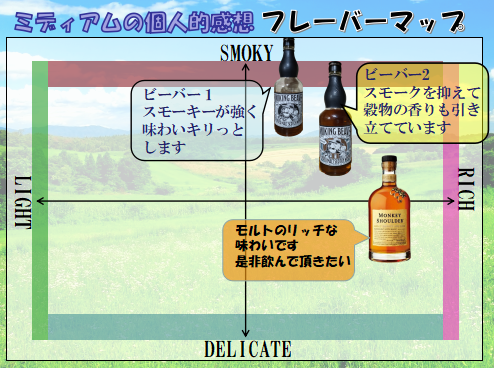 フレーバーのイメージです 個人的感想のフレーバーMAPですが 自分のイメージで表現すると こんな感じです モンキーショルダーはスモークが弱いので対照的ですが リッチな味わいですよ
