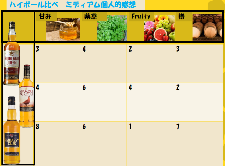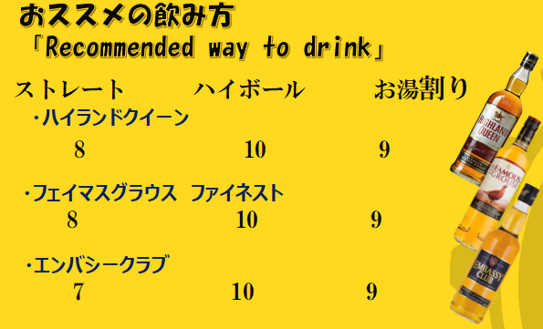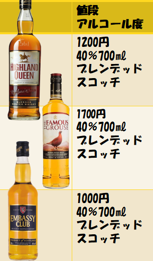 ハイランドクイーン「Highland Queen」、フェイマスグラウス「Famous Grouse」、エンバシークラブ「Embassy Club」