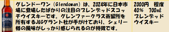 グレンドーワン(Glendowan)は、2024年に日本市場向けに再登場した注目のブレンデッド・スコッチウイスキー。シェリー樽系の甘みとスモーキーさが絶妙に調和した、コスパ抜群の一本です。
