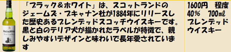 ブラック&ホワイト(Black & White)は、スコットランド産のブレンデッド・スコッチウイスキーで、黒と白のテリア犬が描かれたラベルが印象的なクラシックな銘柄です