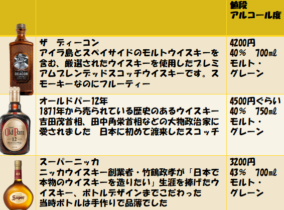 「ザ・ディーコン」は、ウッド・スモークの爆香と焦がしオレンジ 「オールドパー」は、シェリー樽の風味 リッチなフルーツ12年の熟成した味わい 「スーパーニッカ」は、華やかな穀物とハチミツの甘み