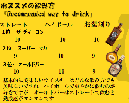 ザ・ディーコンは、ストレート、ハイボール、お湯割りで、それぞれ飲んで頂きたい 飲み方で美味しさが異なって感じるのでディーコンは、とっても美味しいウイスキーです