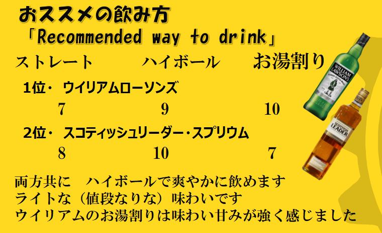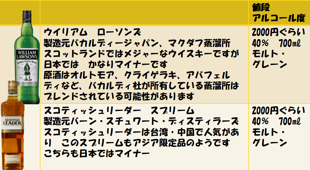 ウイリアムローソンズもスコティッシュリーダーも似たようなウイスキーです ライトでフルーティな香り しかもちょっと甘くて飲み易い! これは お試しに購入してもいいかなぁ