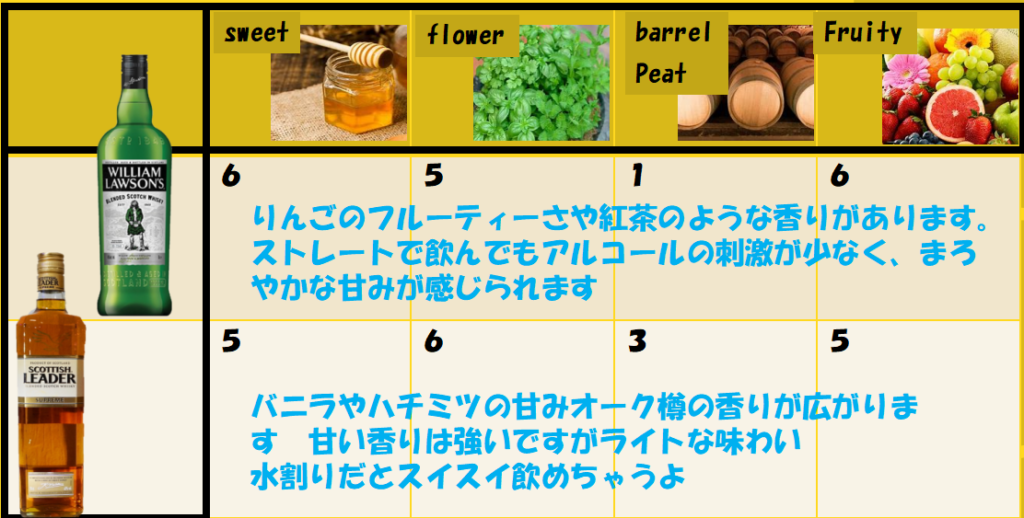 ウイリアムローソンズは、フルーティな味わいは強いけど香りはライト 変わりにスコティッシュリーダーは味わいはライトですが甘い香りは強いです