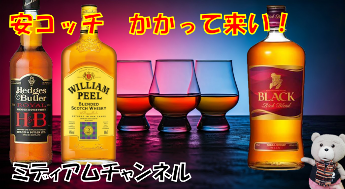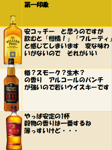 今回は、ウイリアムペール、ヘッジス&バトラー、ブラックニッカ リッチブレンドと飲み比べです      だいたい値段帯は一緒 1000円台で買えるブレンデッドウイスキーです